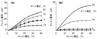 (a) 未処理熱酸化SiO2ゲート表面上,(b) HMDS処理熱酸化SiO2ゲート表面上