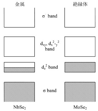 NbSe2では,Nb原子の価電子は(4d)4(5s)1,Se原子の価電子は(4s)2(4p)4である。このうち2個のSe原子の4s電子4個は孤立電子対をつくり,層間に突き出ているSeのsp3混成軌道の一つにそれぞれ入り,ファンデルワールス力を誘起する。次にNbの5s電子と3個の4d電子,および2個のSeからの8個の4p電子の合計12個の電子がσバンドを占める。最後の1個のNbのd電子はdz2バンドに入る。よってdz2バンドは半充満帯となり,NbSe2はdz2バンドを伝導帯とする金属になる。一方MoSe2はMo原子の価電子が(4d)5(5s)1であるため,dz2バンドには2個電子が入り充満帯となる。そのためMoSe2はdz2バンドを価電子帯とする半導体になる。このような単純なモデルがほぼ正しいことは光学測定,X線光電子分光,電子エネルギー損失分光等の数々の実験で確かめられており,またバンド計算からも同様の結果が得られている7)。