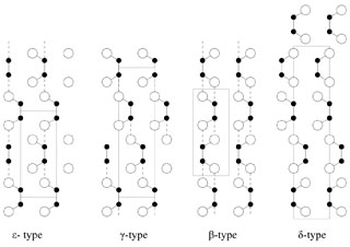 GaSe, GaS, InSe等の13族カルコゲナイドも層状の構造を持つ8),9),10),11)。各単層は,例えばGaSeではSe-Ga-Ga-Seの順序で結合する4原子層から構成され(図5),各単層がファンデルワールス力で結合し,積層している。この積層構造の差異により,ポリタイプが存在する(図6)。GaSの場合は主にβタイプ,GaSeは主にεタイプの積層構造を取る。この二つの積層タイプは,単層2枚が1単位格子となる結晶構造を持つ2Hタイプである。一方,層3枚で1単位格子となるγ-GaSe,4枚で1単位格子となるδ-GaSeも存在する。またInSeは主にγタイプの積層構造を取る。それぞれの化合物,ポリタイプでの格子定数を表3に示す。単層内の結合は共有結合性であるが,13族元素と16族(カルコゲン)元素間の電気陰性度の違いによるイオン結合性も含まれている。このイオン性が,各単層の重なり方に影響する。すなわち,GaSは結合のイオン性が大きいため,全ての13族元素と16族元素が直線上に並ぶようなβ型の積層構造を取ると考えられている。このようなイオン性は,単層間の結合がファンデルワールス力だけではなく,ある程度のイオン結合性を持つ要因となっている。