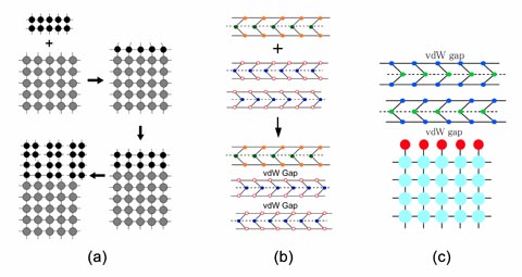 (a) 3次元的物質間でのヘテロ成長,(b) 層状物質間でのヘテロ成長,