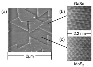 (a) 広範囲像,(b) GaSe単層膜上の原子像,(c) MoS2劈開面上の原子像